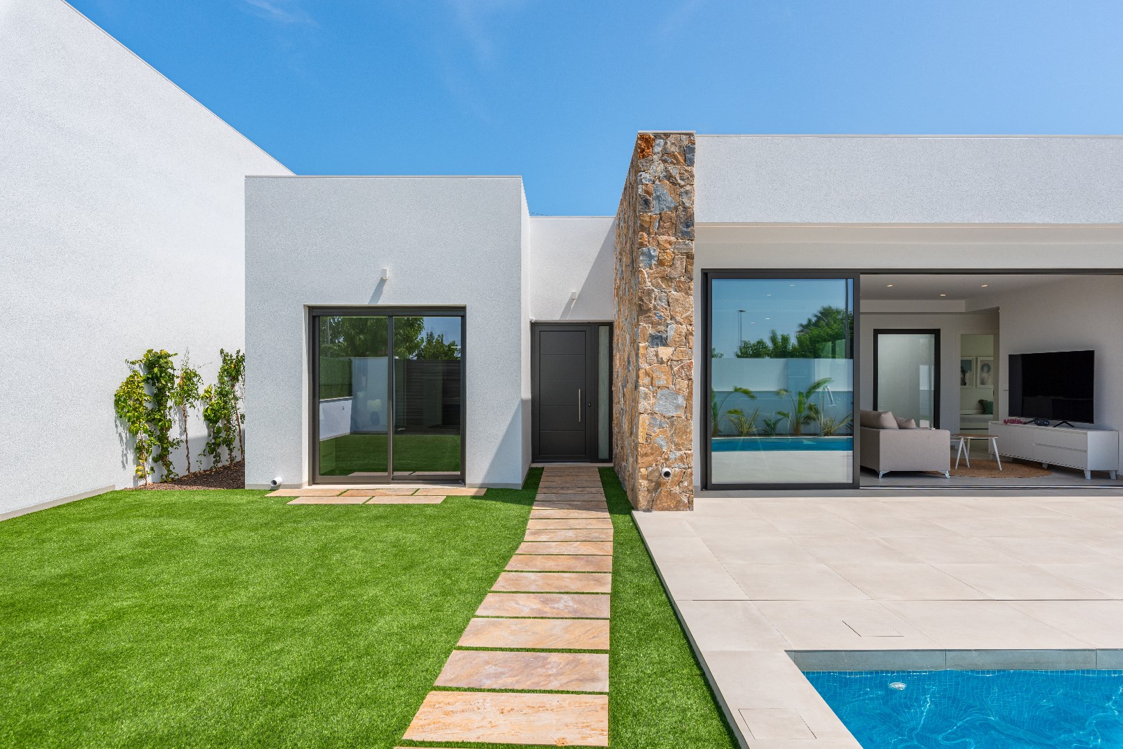 San Javier, Murcia. Deze gelijkvloerse villa wordt gebouwd in een rustige woonwijk in het noorden van de Costa Calida in San Javier. Op een kleine 3 km fietsafstand van de villa vindt u het pittoreske Santiago de la Ribiera, een gezellig kustplaatsje dat deel uitmaakt van San Javier.